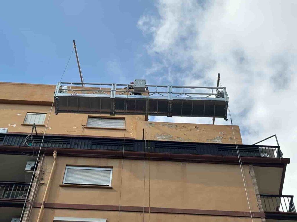 A mediados de diciembre, nuestros operarios regresaron al lugar para trasladar el andamio colgante, que posee un pescante de 6 metros, a otro punto de la fachada del edificio. De esa forma, el cliente ha podido continuar con los trabajos. La intervención consiste en sustituir todos los balcones del edificio, que son de hierro, por otros fabricados en aluminio.